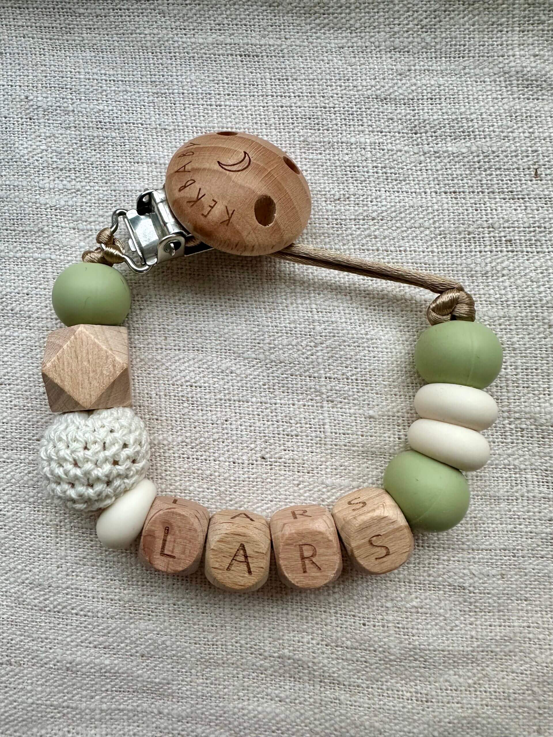 - De letterkralen zijn van hout of acryl. De clip is gemaakt van onbehandeld beuken hout. Het speenkoord wordt aangevuld met beuken houten kralen.
