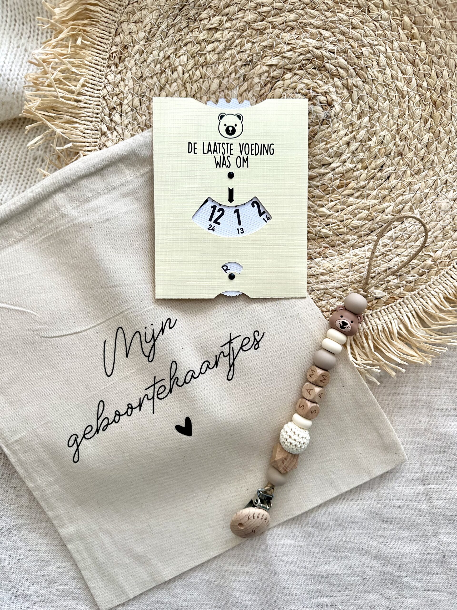 Geef bij bestel notities ( aan het eind van het afreken proces) even de naam van het kindje door voor het speenkoord.